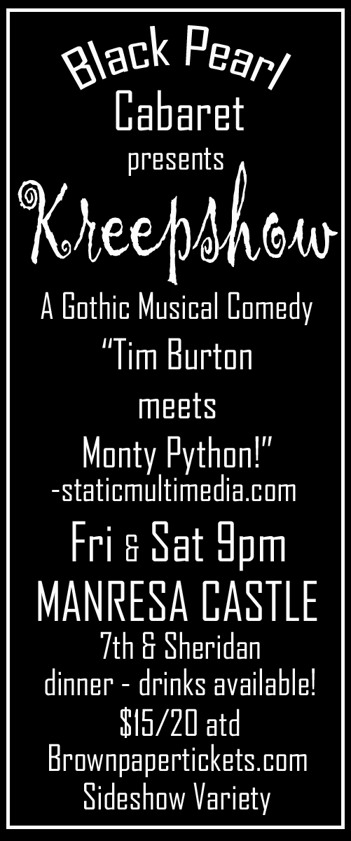 Presented by the Black Pearl Cabaret, KREEPSHOW, a Gothic Comedy Cabaret, opened for an extended run, and plays every Friday and Saturday at 9 pm at the historic Manresa Castle, 651 Cleveland St, Port Townsend, Washington.
