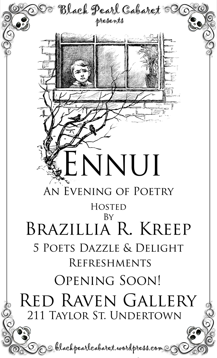The Black Pearl Cabaret is most proud to present ‘Ennui,” An Evening of wistful Poetry hosted by Cpt. Brazillia R. Kreep and presented at the Red Raven Gallery, 211 Taylor St., Undertown, Port Townsend. Special Guest poets include Harold Arthur McNeill, Tassa Briel Greif, and Ares Altamirano. Refresments available.